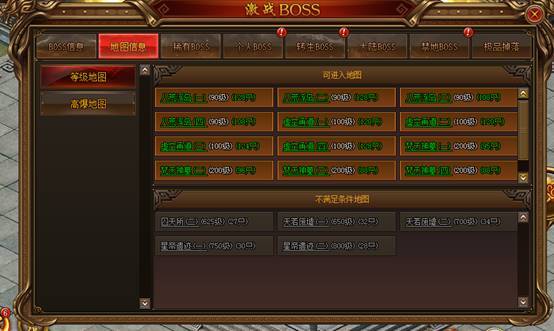 BOSS进行传送地图,查看怪物形象、名称和数量,等级不够未开启的地图会显示灰色
