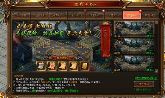 每人每天有3次击杀禁地boss的次数,也可通过禁地令牌增加击杀boss次数